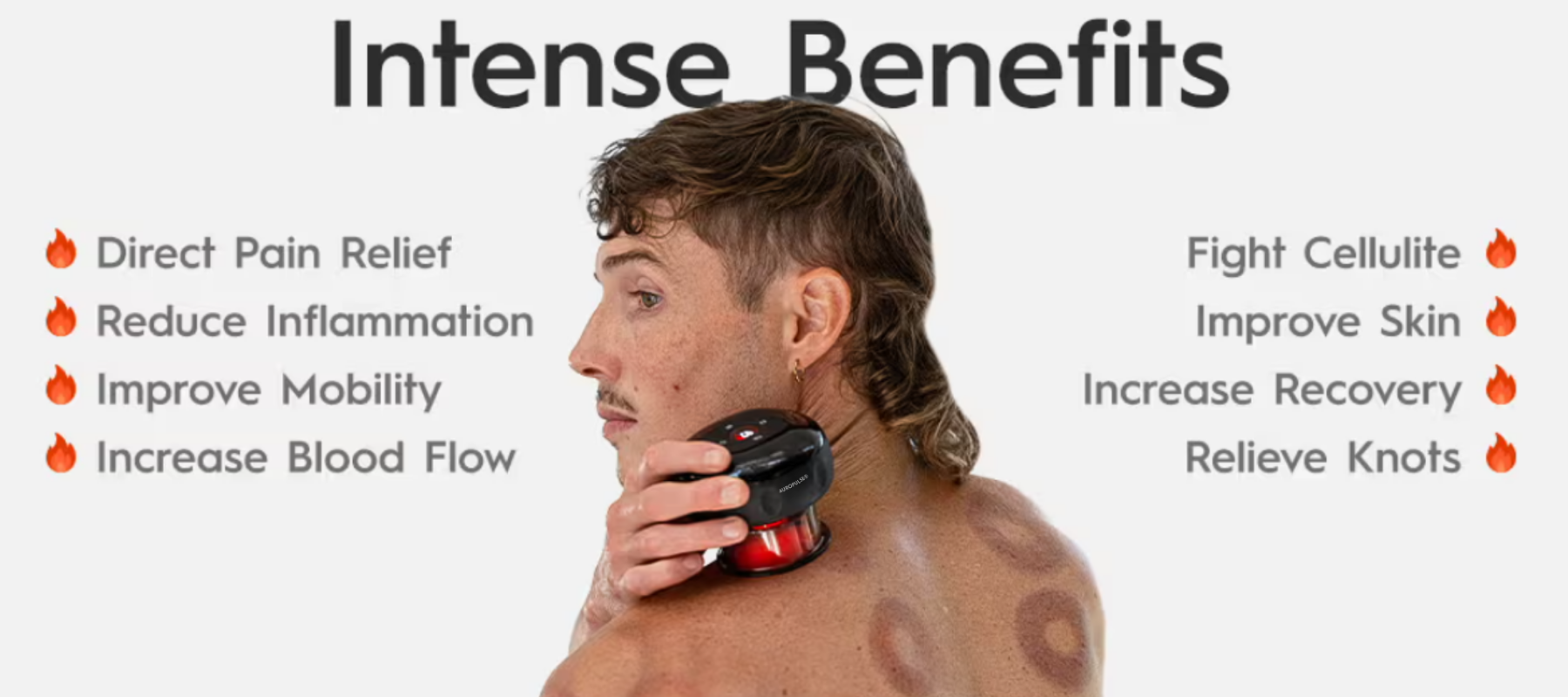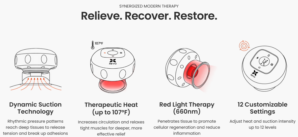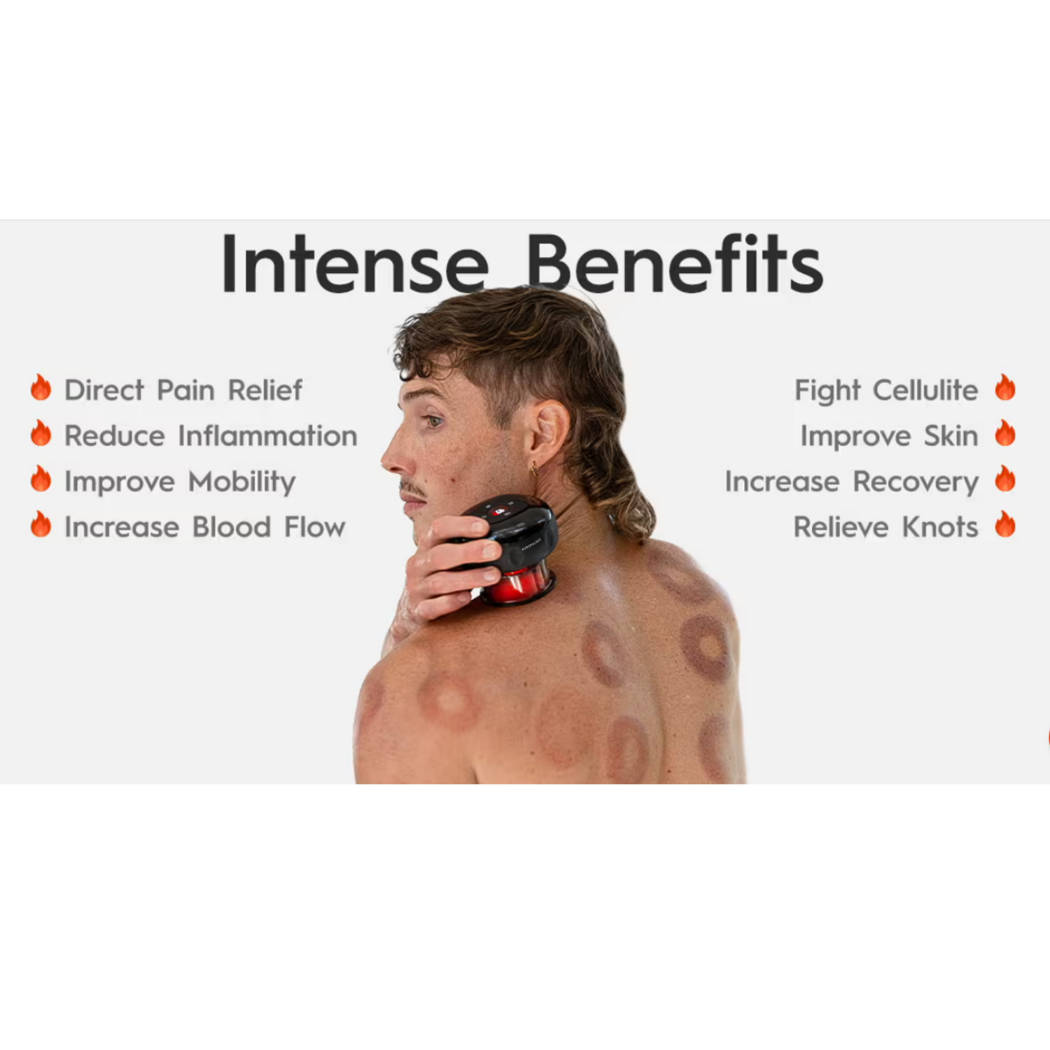 It combines intelligent suction, therapeutic heat, and rhythmic pulsation to relieve pain, improve circulation, and relax muscles deeply