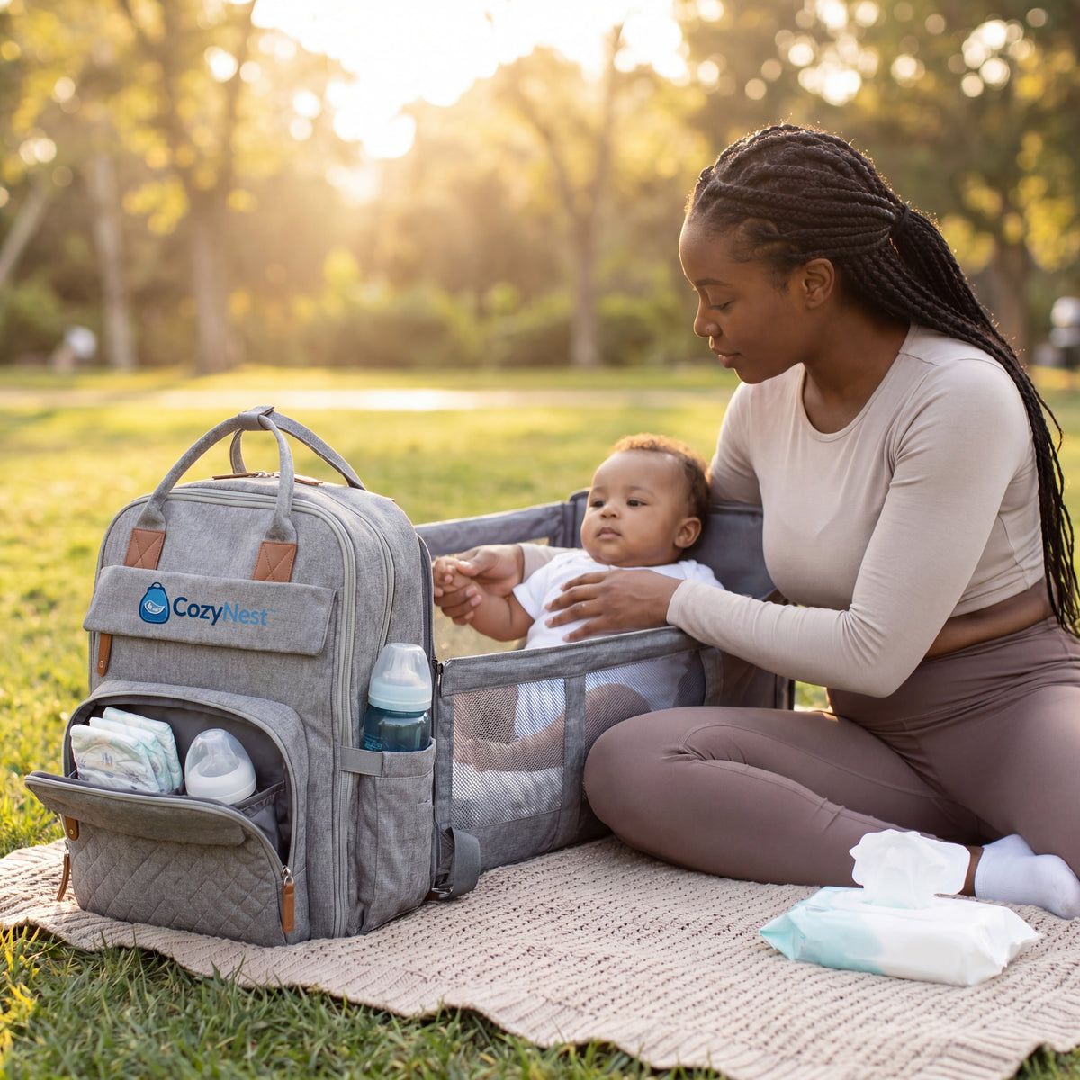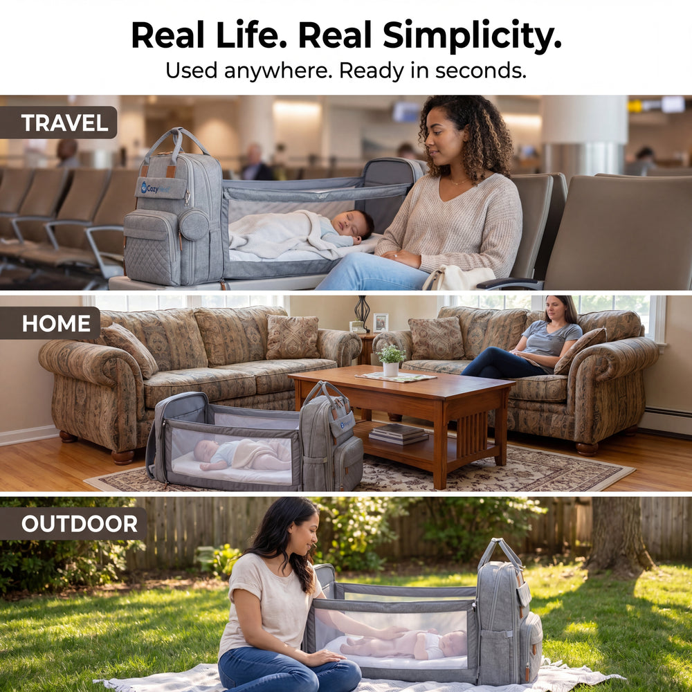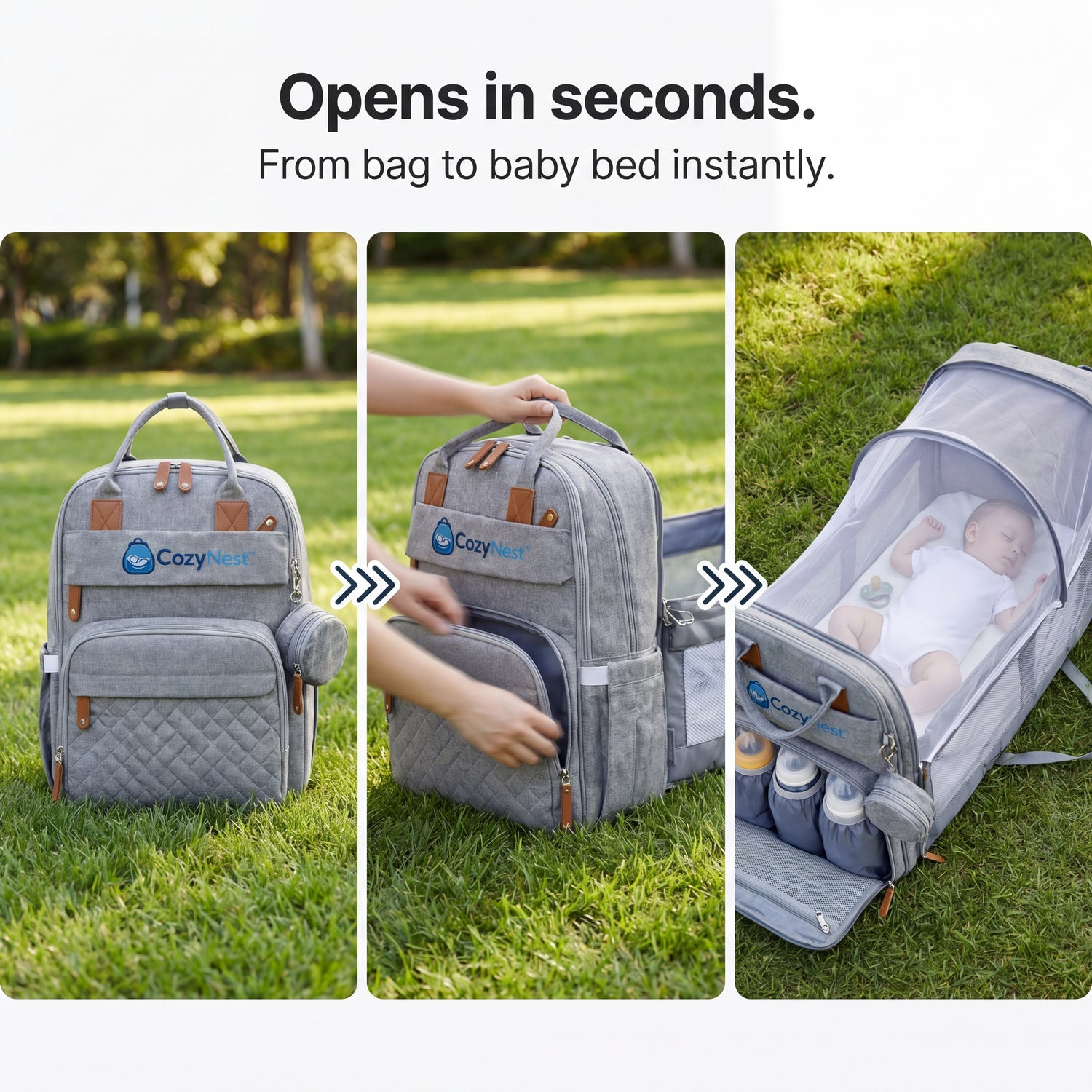 “The CozyNest™ is designed for quick, practical use. In seconds, you unzip the back compartment and unfold it into a portable crib. This allows you to safely change or rest your baby anywhere, without needing to search for a proper place.”
